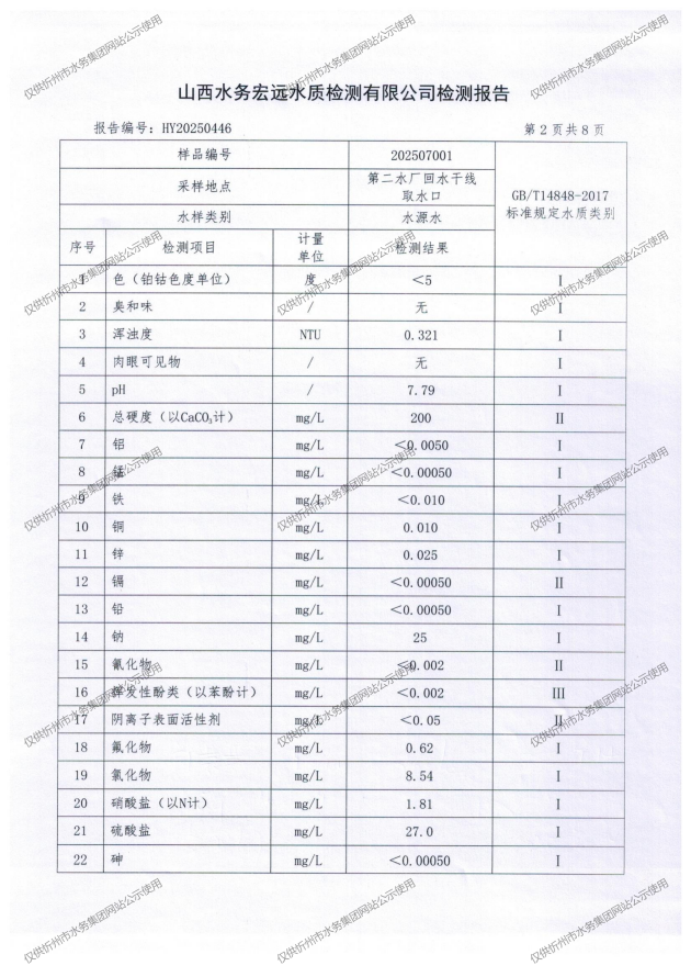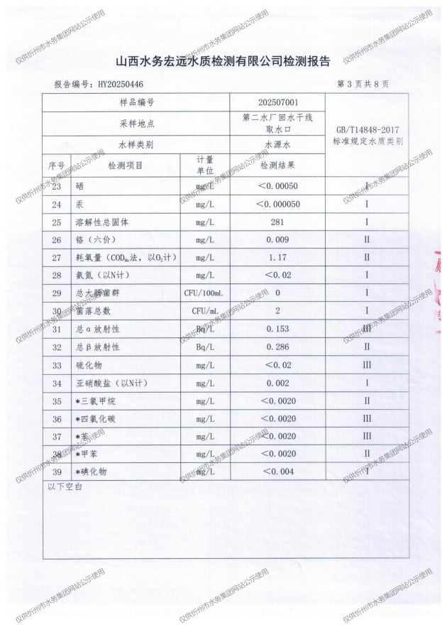 忻州城區(qū)公共供水水源水、出廠水、管網(wǎng)水、管網(wǎng)末梢水2025年7月份水質(zhì)信息公示