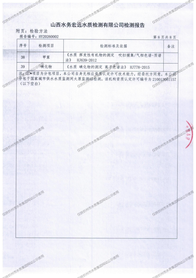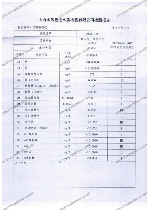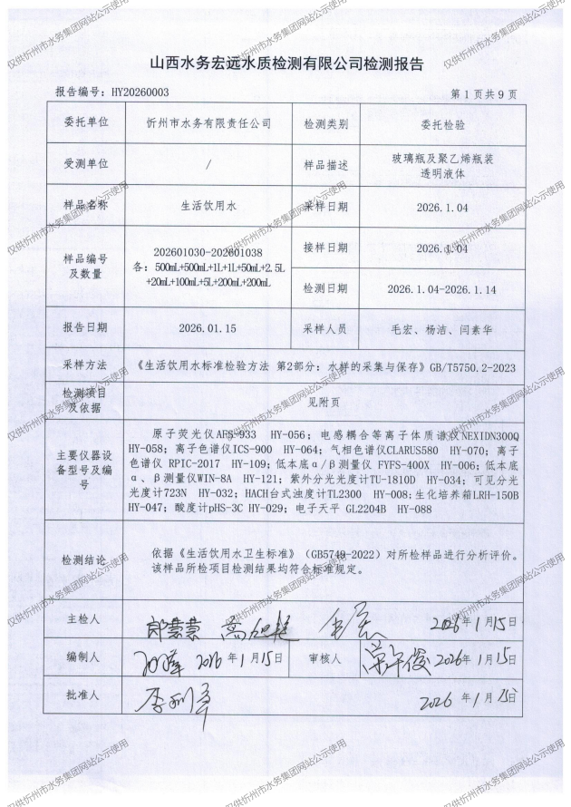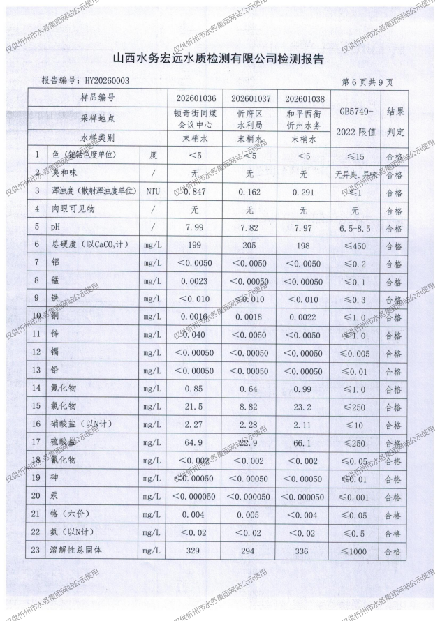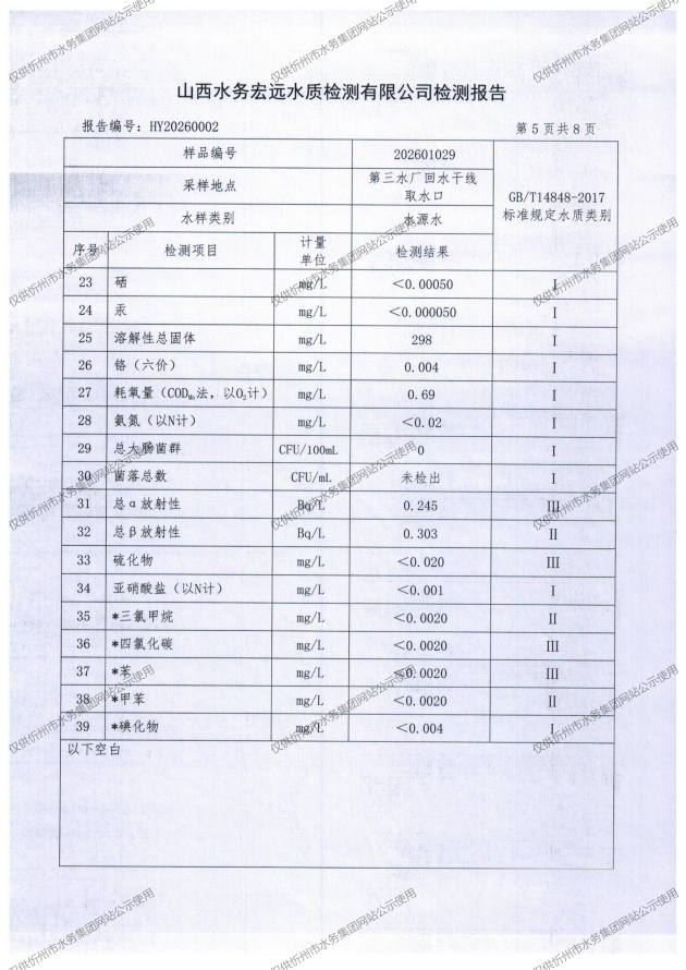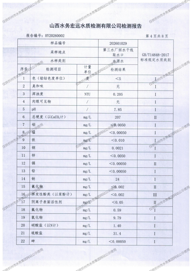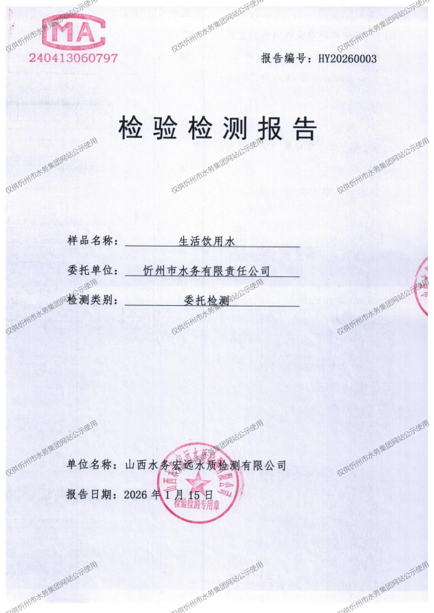 忻州城區(qū)公共供水水源水、出廠水、管網(wǎng)水、管網(wǎng)末梢水2026年1月份水質(zhì)信息公示